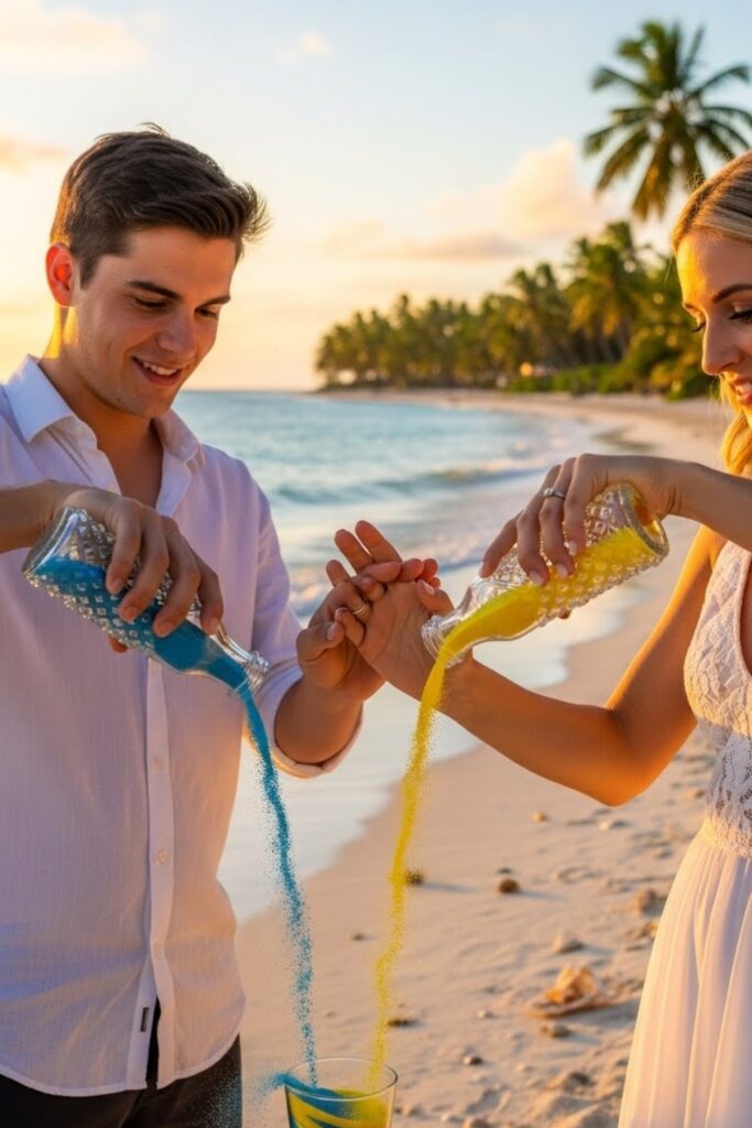 If you want a meaningful moment, a sand ceremony lets you visually blend colors to symbolize unity during the vows together.