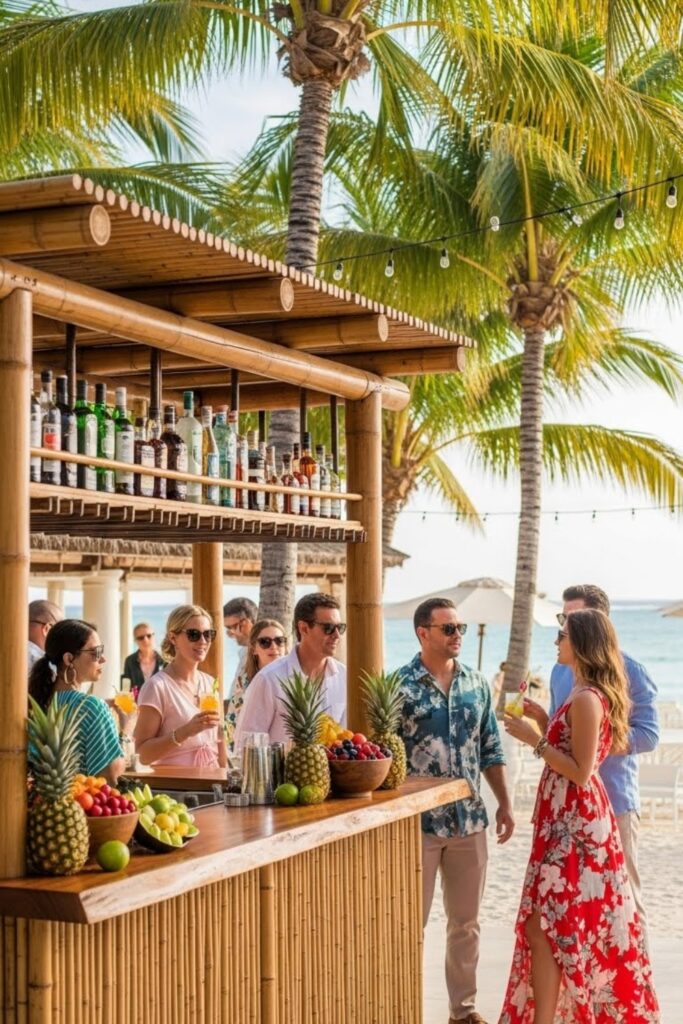 Use natural wood, woven textures, and tropical garnishes so the bar looks styled without feeling overdone in warm outdoor settings everywhere.