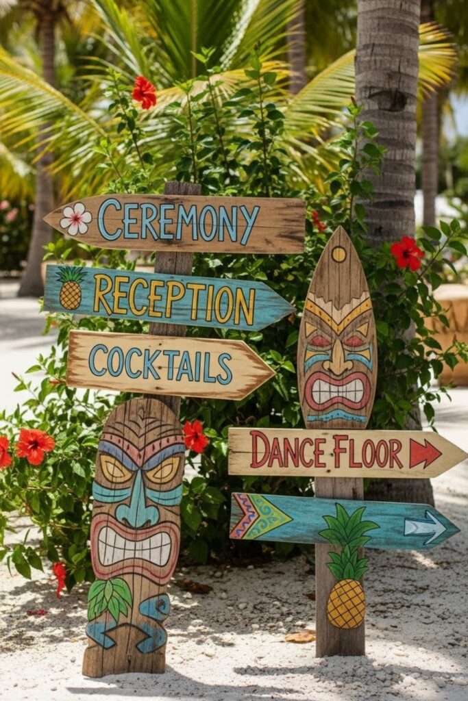 Directional tiki signs instantly add personality and help guests navigate outdoor spaces without confusion during ceremonies, receptions and evening events easily.