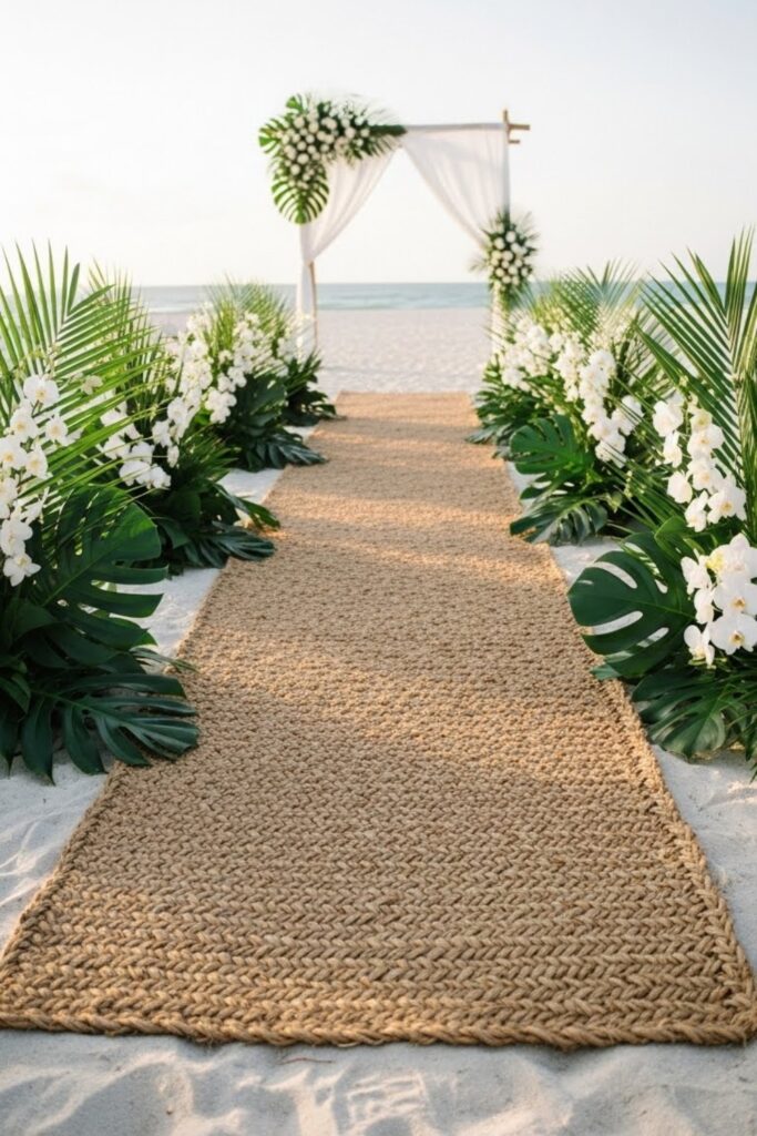 Instead of a traditional aisle runner, imagine walking through a pathway that feels like a tropical escape.