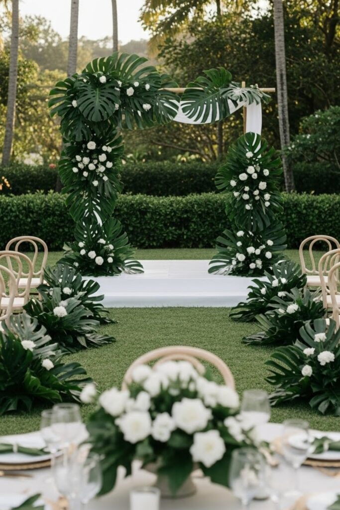 Big, glossy monstera leaves create instant drama without flowers, making them perfect when you want bold tropical style quickly for ceremonies.