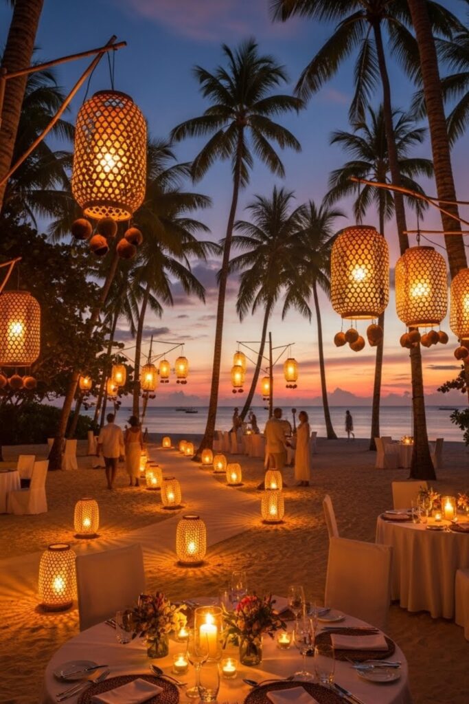 Use paper, rattan, or glass lanterns so lighting feels soft, not harsh, and matches the relaxed tropical mood for outdoor celebrations.
