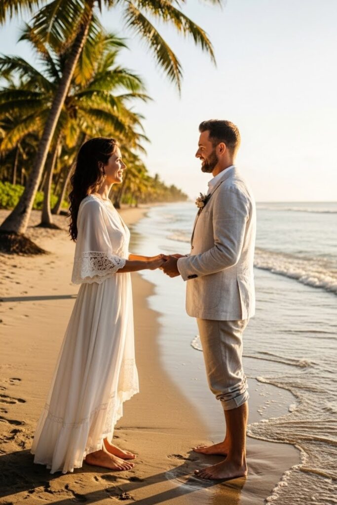 For men, linen suits, light shirts, or even tailored separates feel right. Shoes matter too – heels sink in sand, so flats or wedges make more sense.