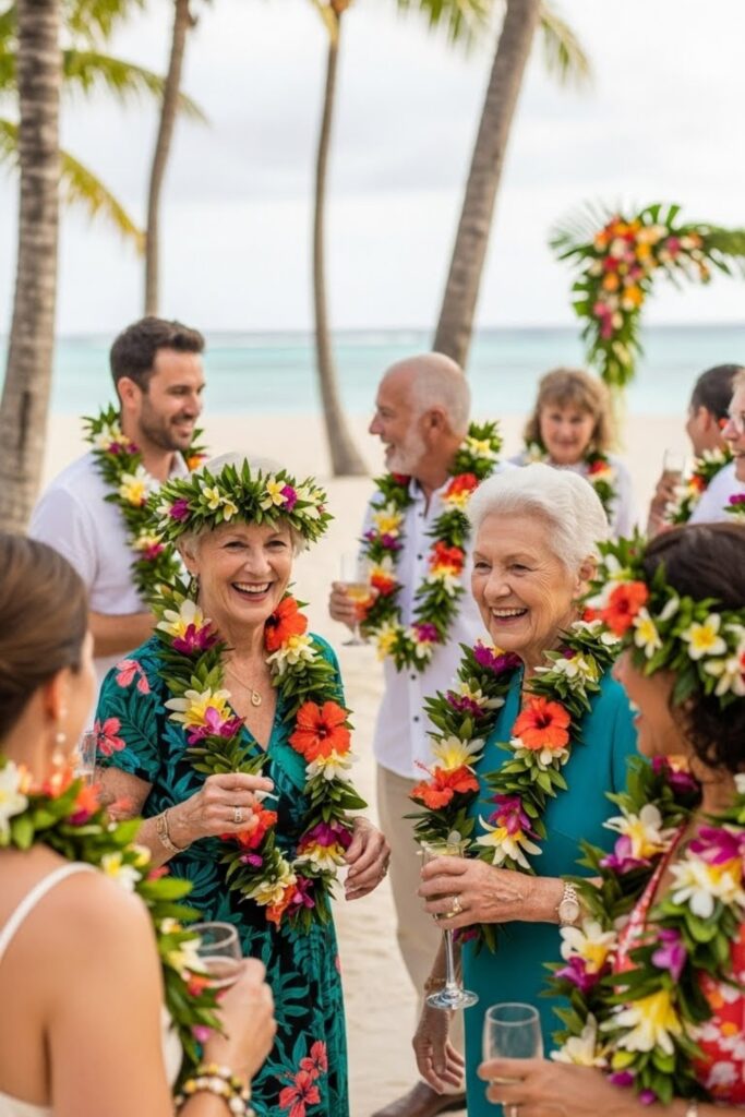 Leis can replace corsages or boutonnieres, keeping things lightweight, meaningful, and perfectly suited for warm tropical weather.