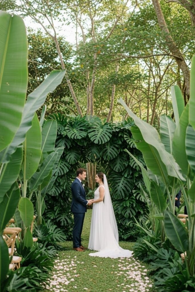 Tropical flowers, natural materials, soft lighting, and breathable styling—even in a backyard, garden, or indoor venue with good light and greenery.