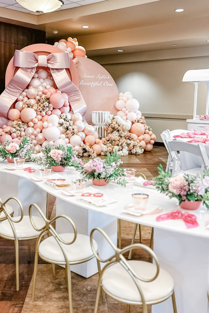 If elegance is your direction, go all in. A soft blush and bow-inspired setup instantly feels polished and feminine without screaming “baby.”