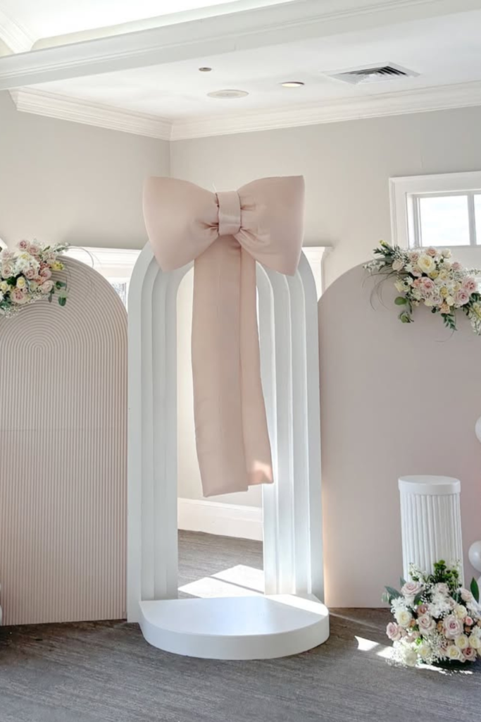 Neutral arches paired with a single oversized bow instantly create a soft, editorial look.