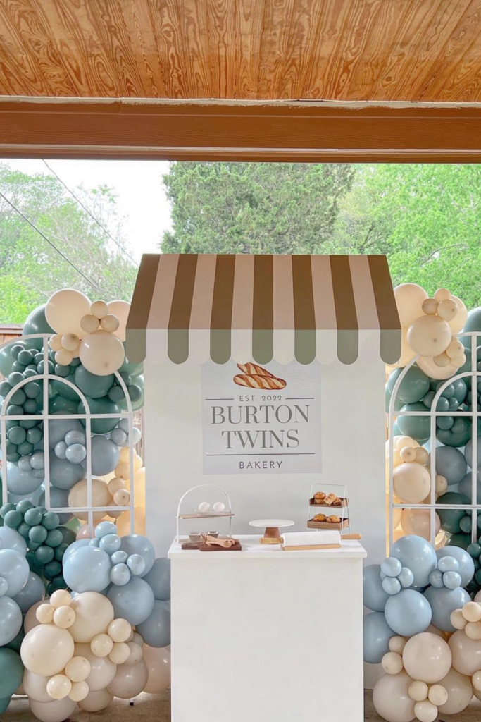 Two statement balloons labeled “Twin 1” and “Twin 2” instantly make the theme clear without heavy decor.