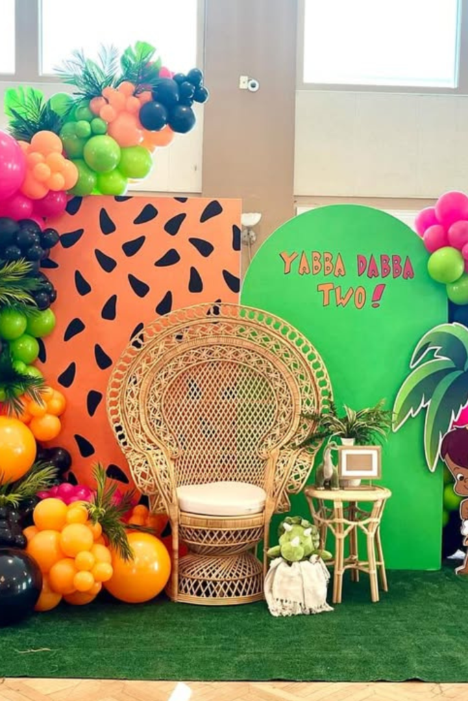 A “Yabba Dabba Two” Flintstones-inspired setup thrives on vibrant color and oversized graphics.