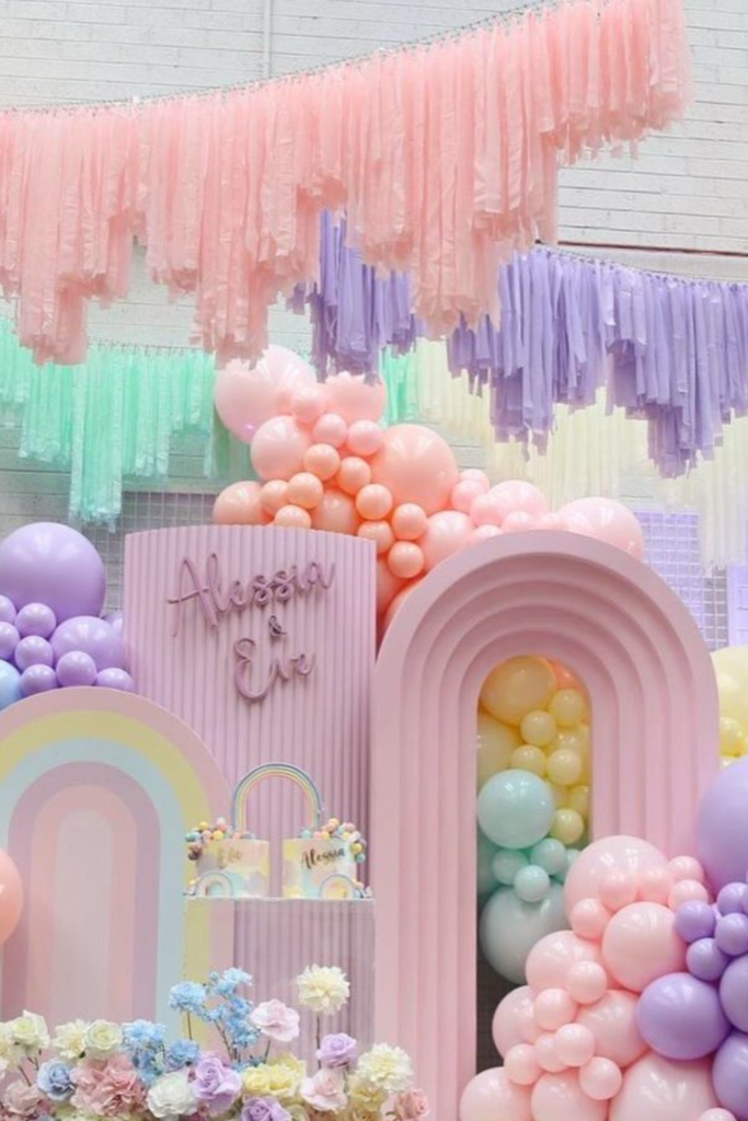 A pastel rainbow setup feels dreamy and perfect for twins because it naturally embraces more than one tone.