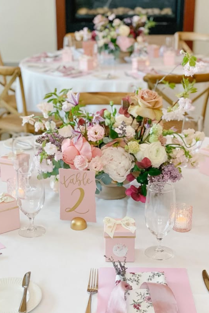 Soft pink linens, layered florals, and tiny favor boxes make each place setting feel intentional.