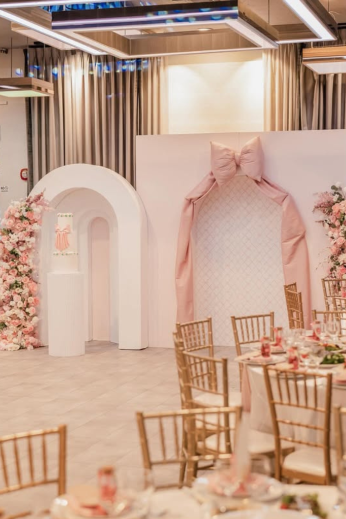 An oversized bow backdrop sets the tone immediately -soft, feminine, and polished.
