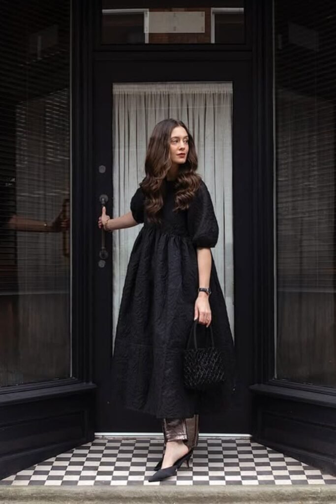 A textured black midi dress, pointed flats for comfort, and a woven little bag will keep the outfit looking sharp without being too heavy.