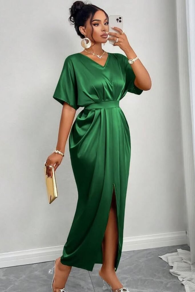 A draped satin emerald midi dress is perfect for evening celebrations, formal dinners, and indoor garden weddings where bright colors look great in dim light.