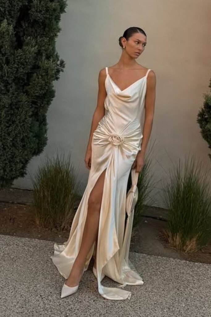 The smooth drape, thigh slit, and waist rosette are perfect for high-end outdoor weddings, fashion-forward ceremonies, or editorial-style venues.