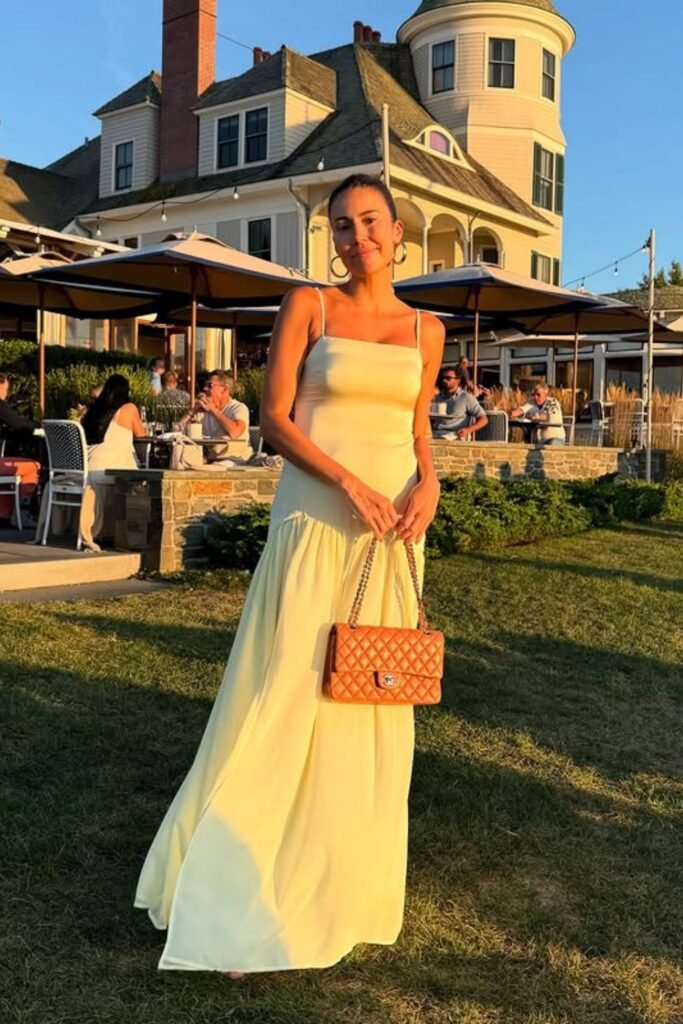 Golden hour changes how colors behave, and this pale yellow maxi uses that light to look soft instead of loud.