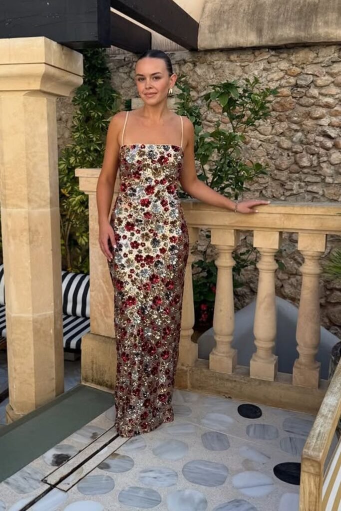A sequined floral column dress is perfect for outdoor dinners by candlelight, vacation events, and evening terrace weddings where the shine feels planned.