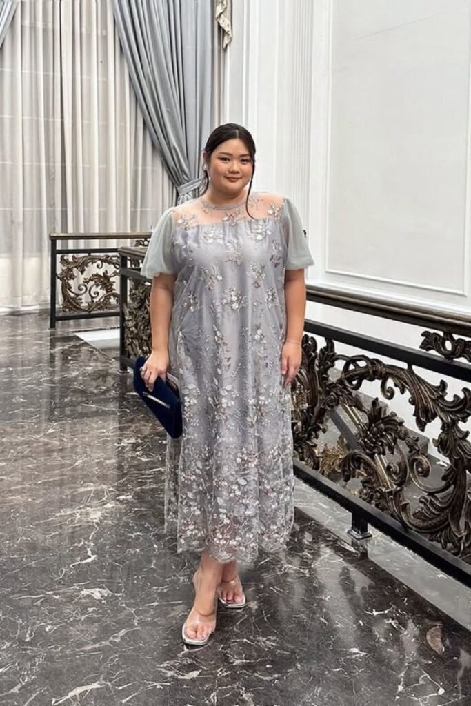 Light catches differently on sheer layers or that’s what gives this silver-gray maxi its quiet glow.