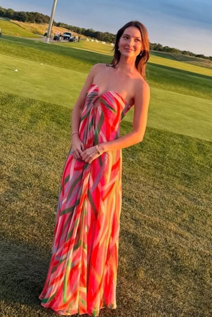 Warm skies invite color that actually shows up on camera, and this strapless swirl maxi does exactly that.