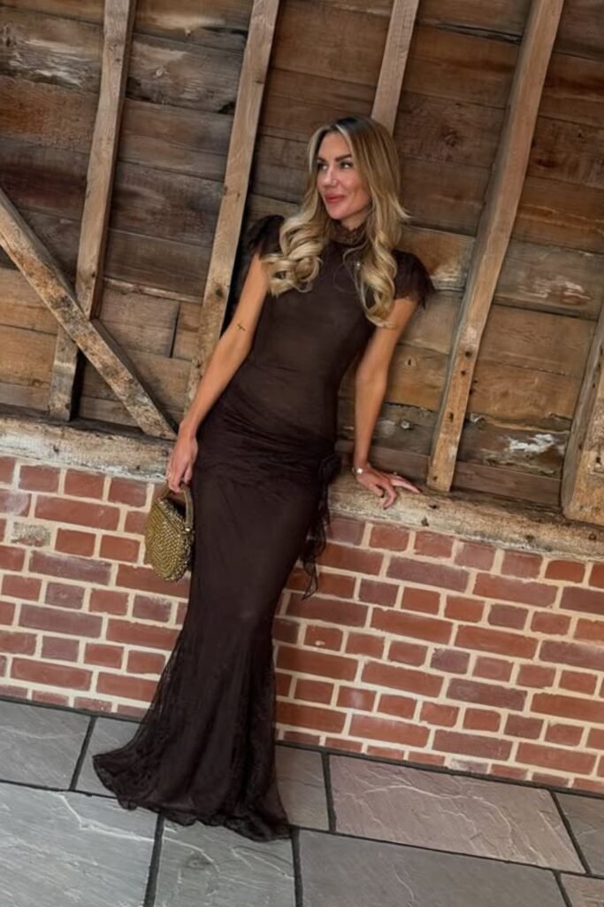 A fitting brown maxi with a delicate sheer hem is perfect for barn weddings, rustic evening and winery locations parties where deep neutrals go well with warm surroundings.