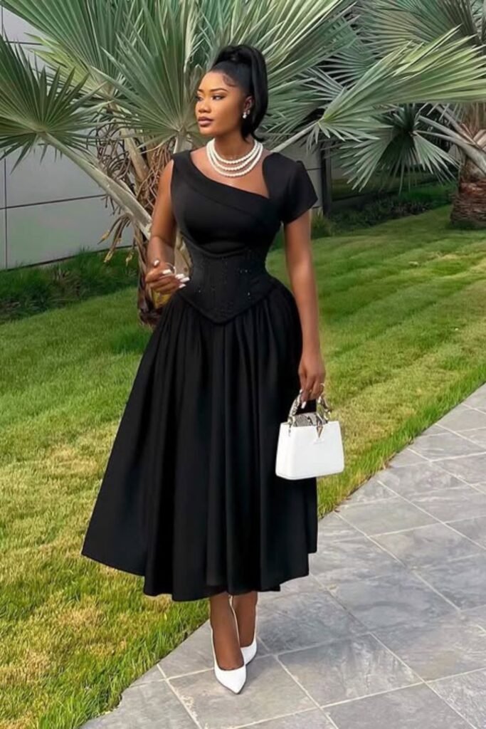 Strong shape always beats loud details, and this corset-waist black midi proves it instantly.