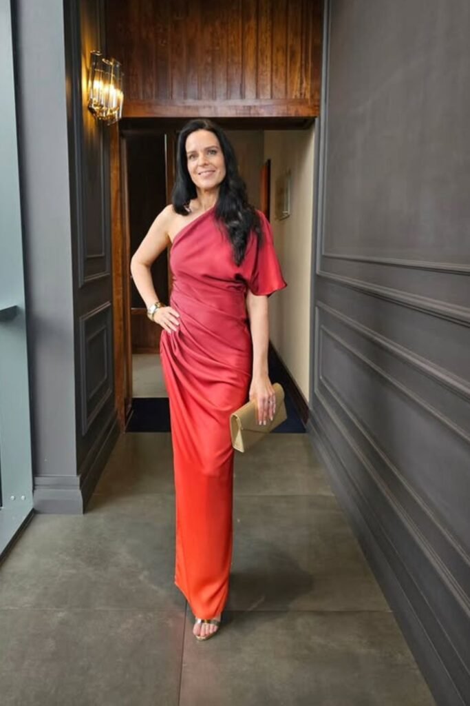 This crimson gown with one shoulder is perfect for hotel weddings, or formal dinners where the lighting stays soft and warm.