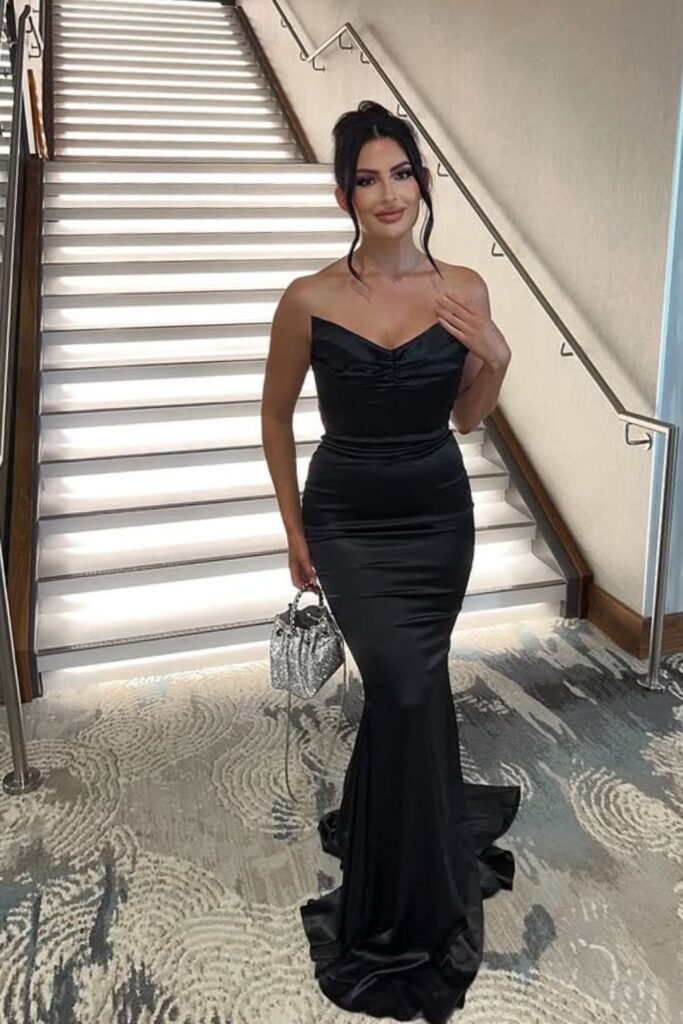 This satin dress with no straps is great for black-tie parties, weddings in posh hotels, or rooms with candles. To keep the shape sharp, use a small crystal purse, a few pieces of jewelry.