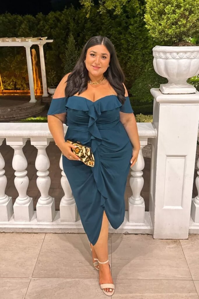 Soft outdoor lighting needs a dress that looks rich without looking heavy, and this teal off-shoulder midi hits that balance perfectly.