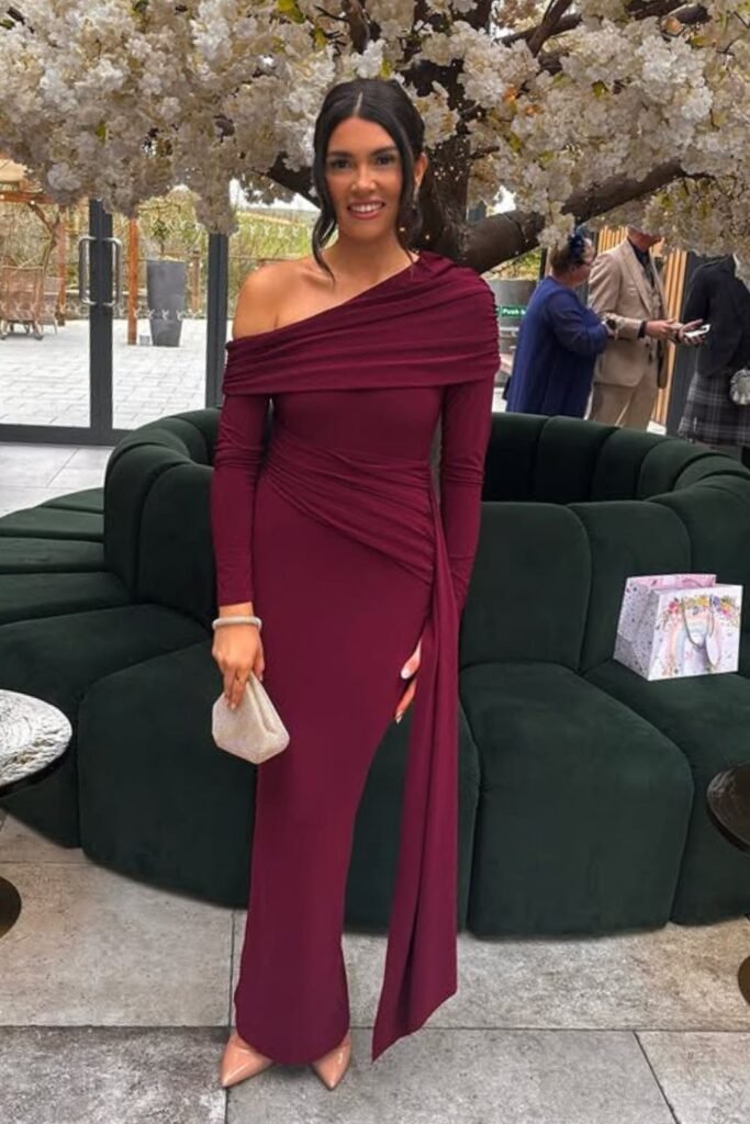 Deep wine tones always signal confidence before you even speak, and that’s exactly what this one-shoulder maxi does.