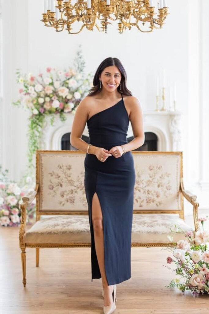 For formal indoor events, ballroom weddings, and beautiful daytime parties, a black dress with one shoulder and a thigh-high slit is the finest choice.