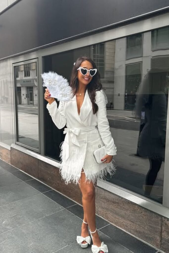 For stylish metropolitan weddings, trendy celebrations, or rooftop sites where bold elements are encouraged, a tiny wrap with white feathers is the finest choice.