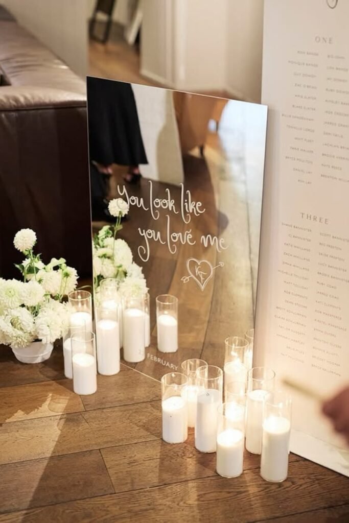 A mirror welcome sign is perfect if you want something elegant that also reflects light, greenery, and movement around the entrance area.