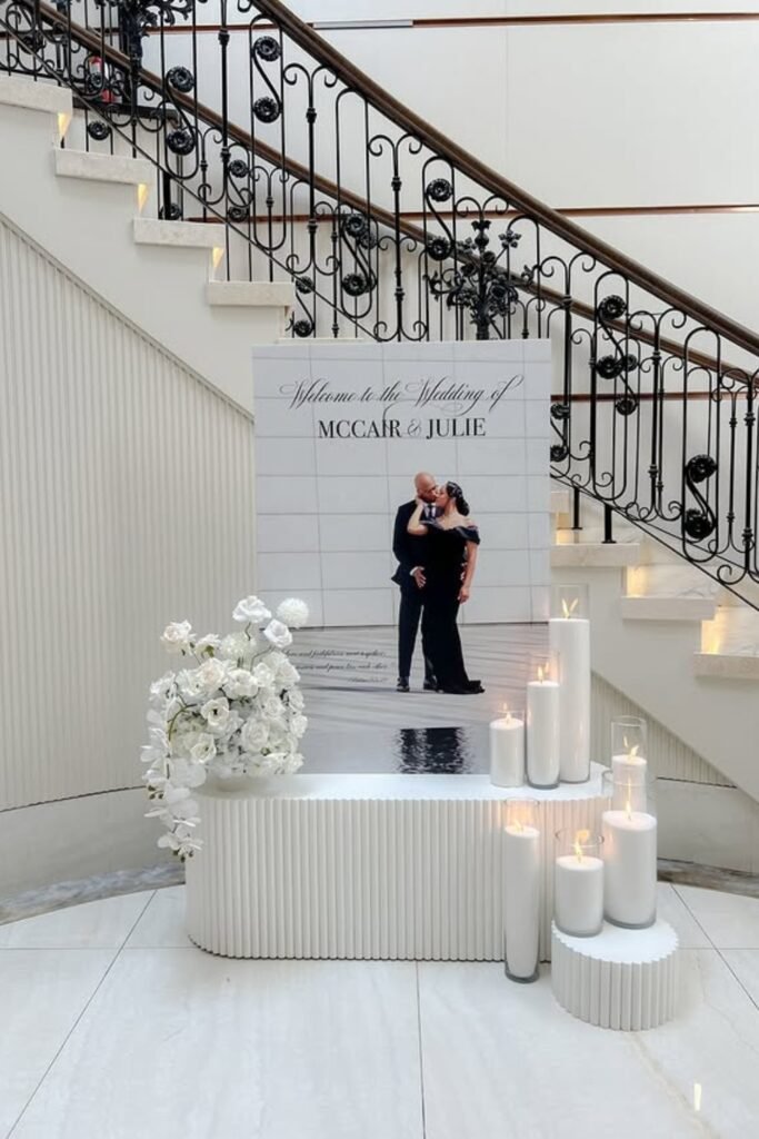 This setup works best near lobby entrances where guests naturally slow down, notice details, and transition calmly into the celebration inside.