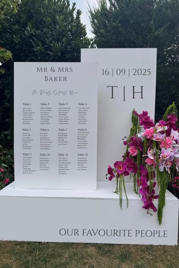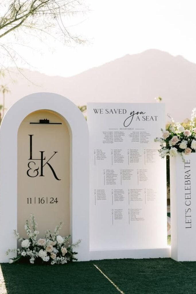 This modern seating display feels structured and elegant, making it easier for guests to find their table without second-guessing anything inside.