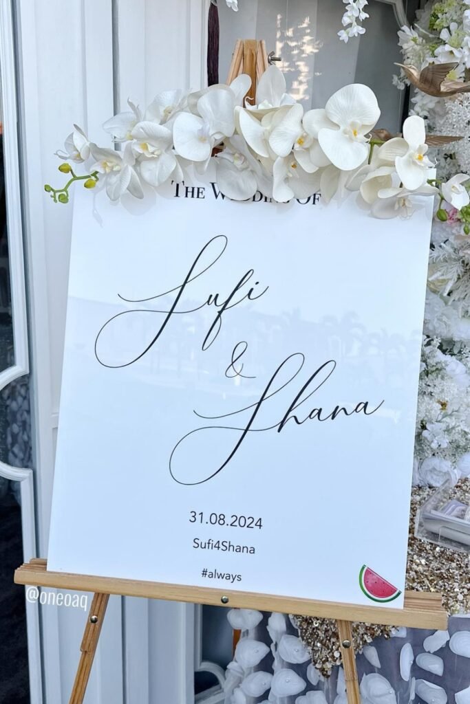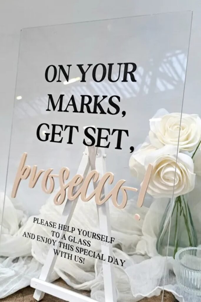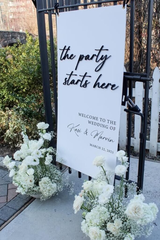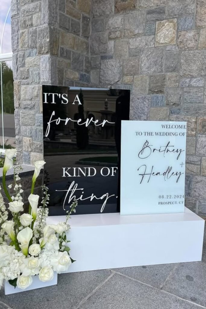 Acrylic signs add polish instantly, especially when paired with soft white florals that balance the sleek, reflective surface.