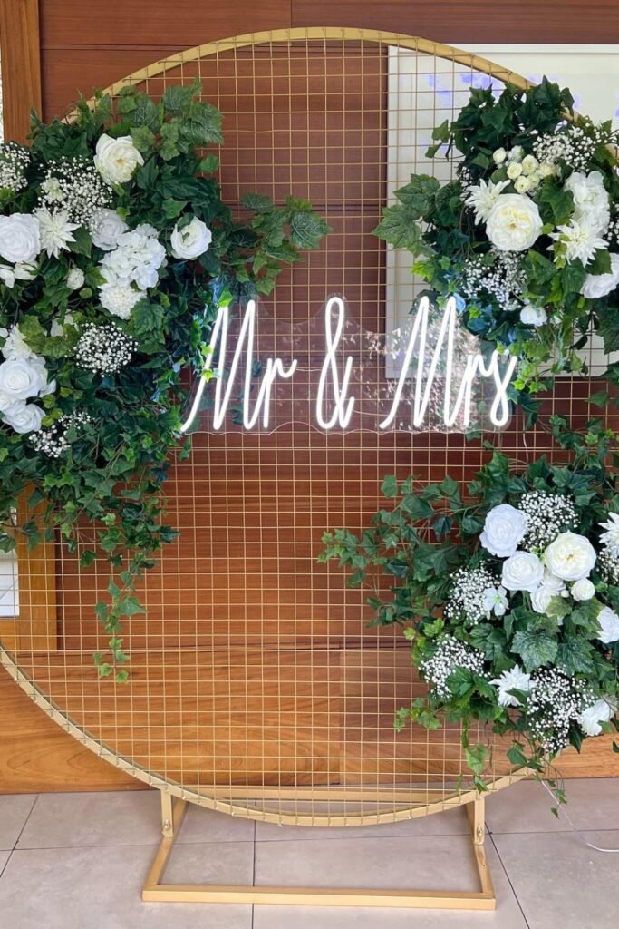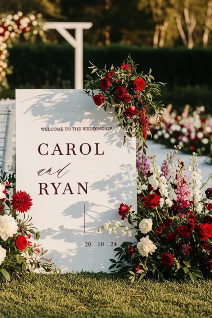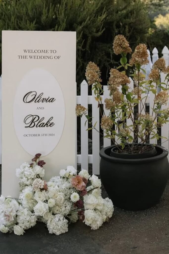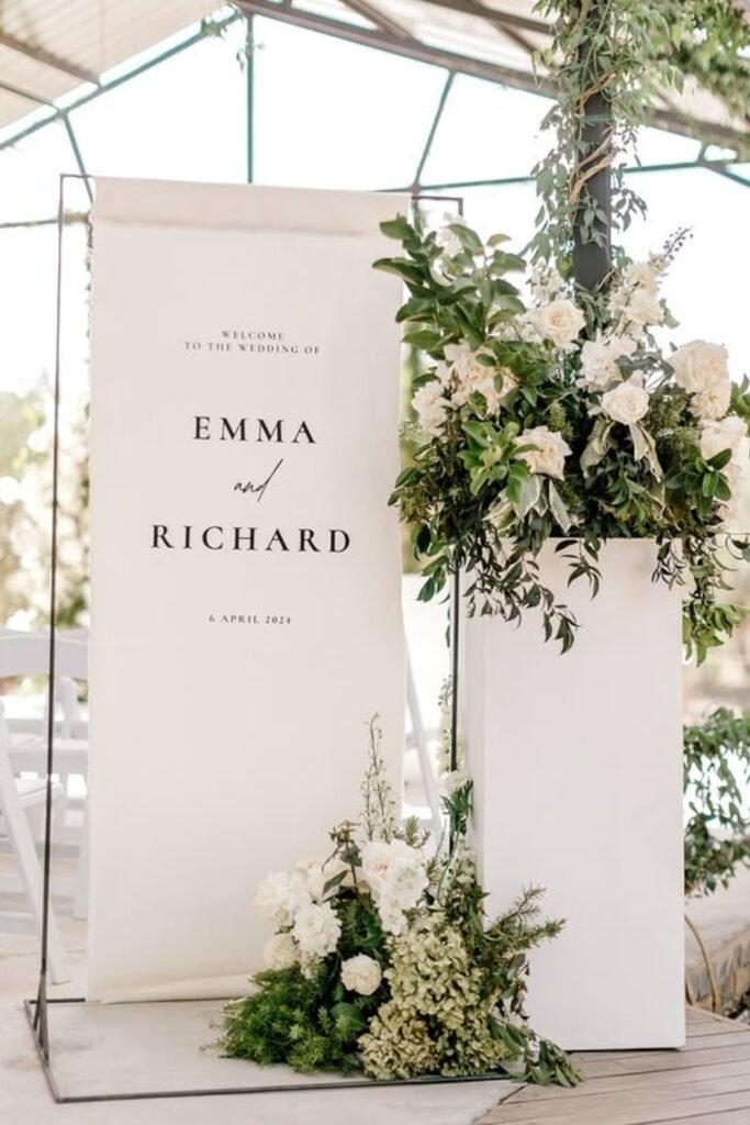 Adding florals only at the top or sides prevents visual clutter and lets the sign photograph beautifully from multiple angles during receptions too.