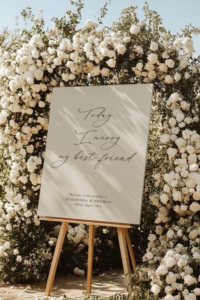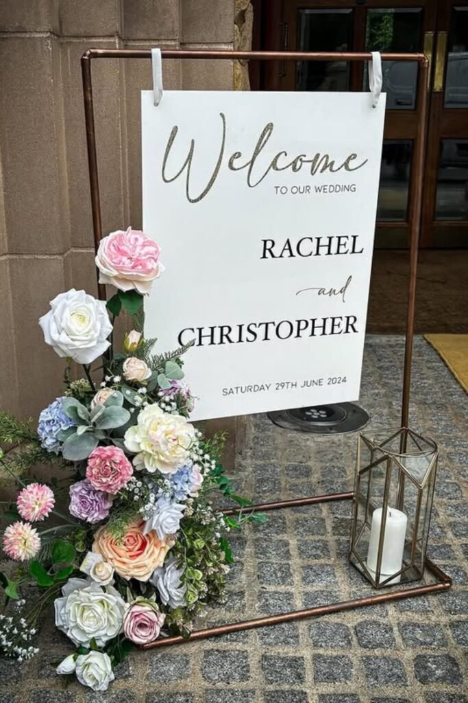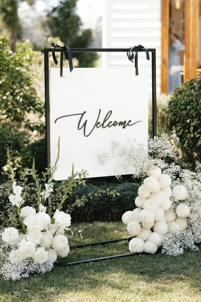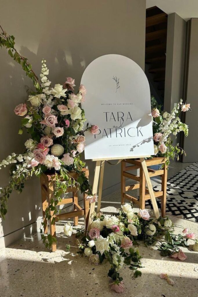 This oversized floral welcome sign instantly sets the mood and tells guests they’ve arrived somewhere intentional and romantic.