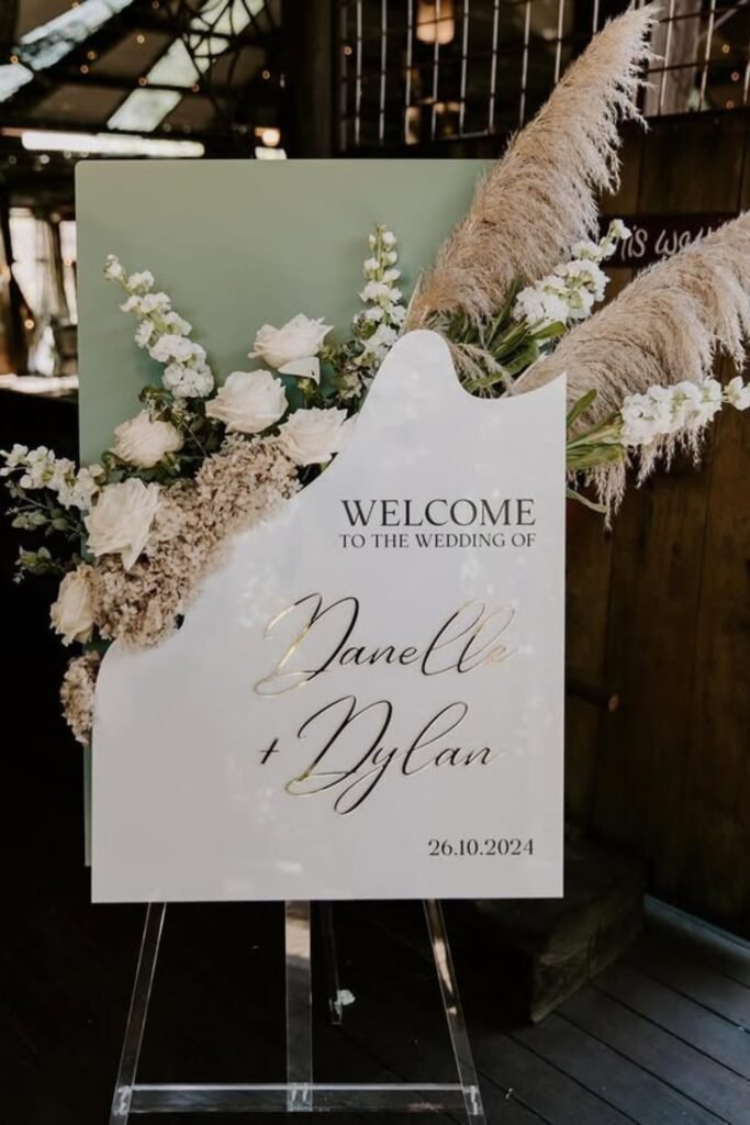 For a clean, modern entrance, an acrylic welcome sign keeps the focus on names and date while still feeling soft and romantic.