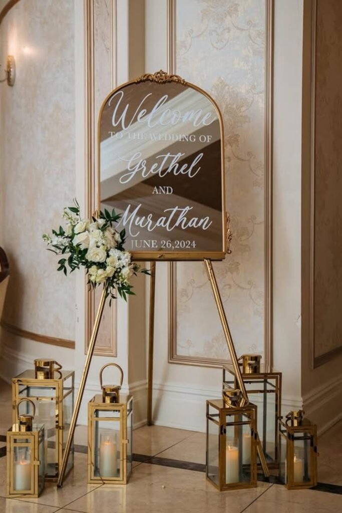 A gold-framed mirror welcome sign instantly elevates formal venues, pairing classic elegance with practical direction for arriving guests.