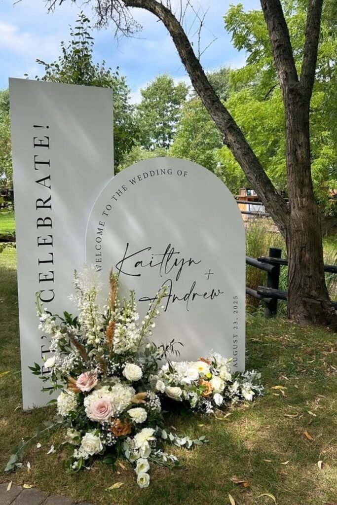 This works especially well outdoors, where sunlight and surrounding plants naturally become part of the sign’s overall design for daytime receptions too.