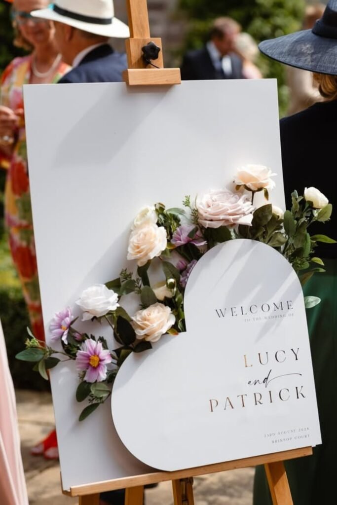 Pairing soft florals with clean typography helps the sign blend into outdoor receptions without overpowering the setup or blocking walking paths.
