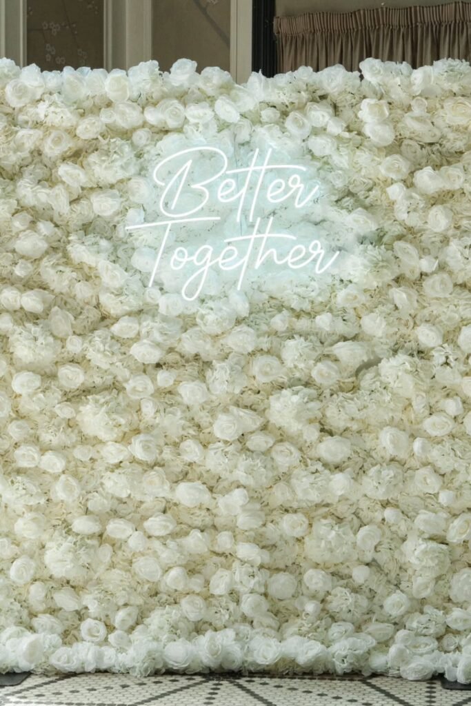 A flower wall with a glowing phrase gives guests an obvious photo moment without needing extra direction during the reception evening.