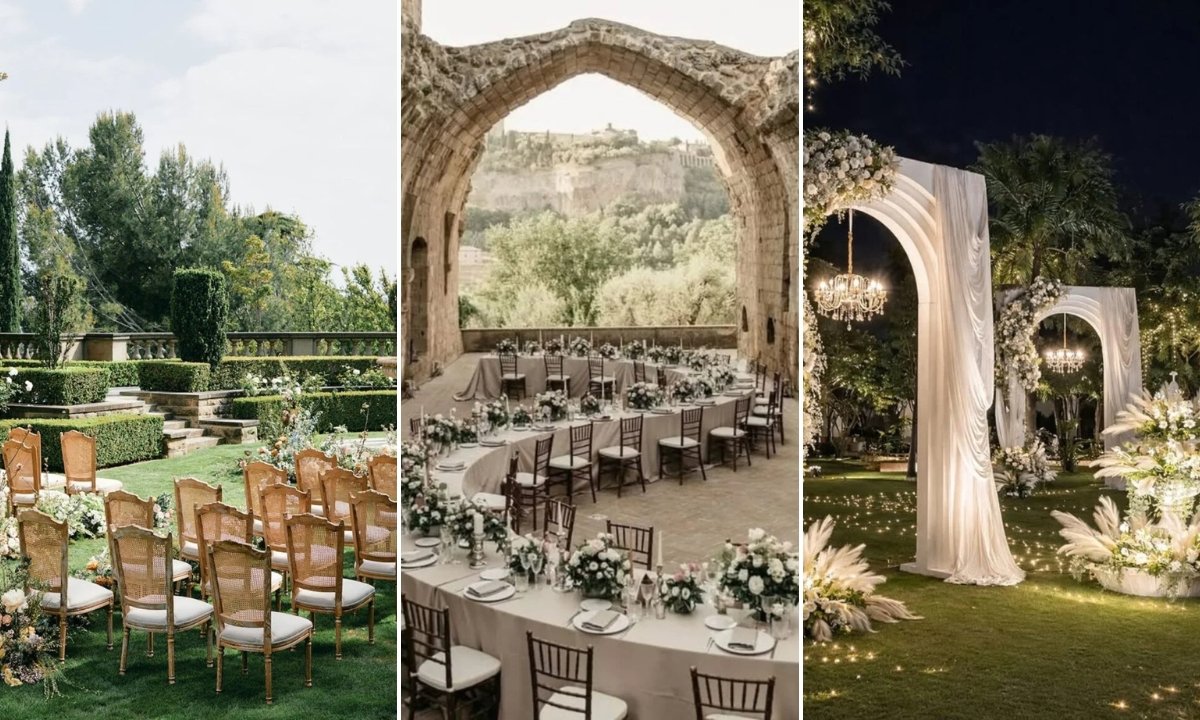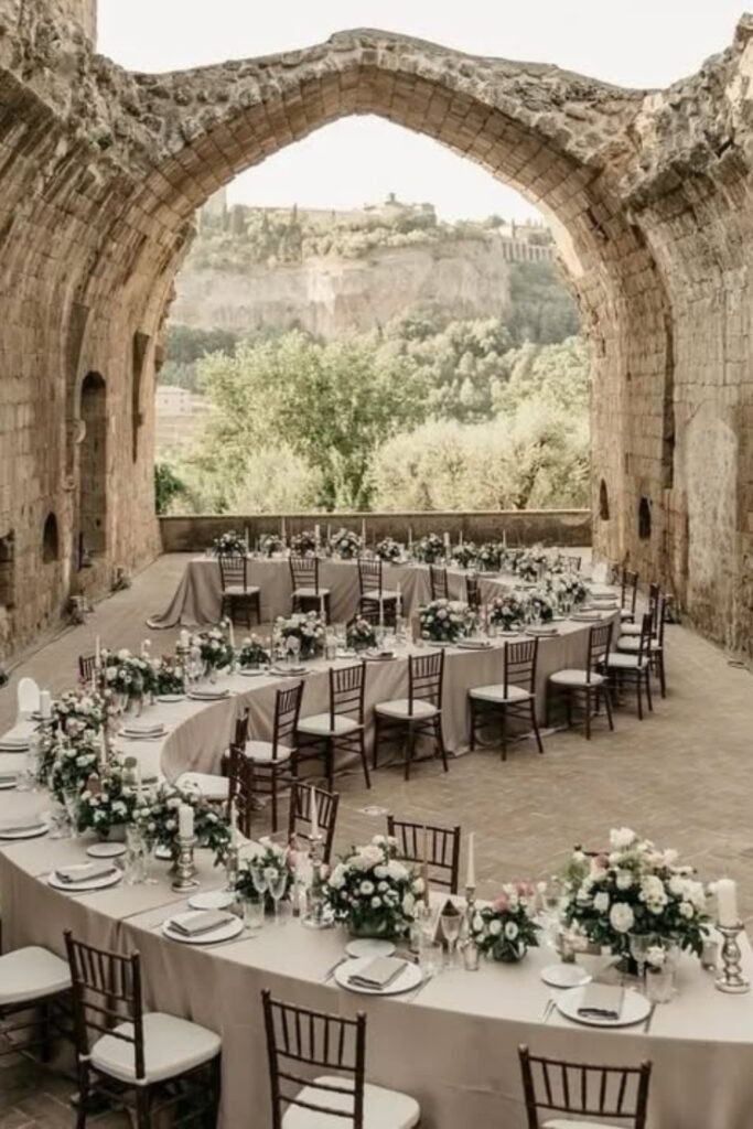 Stone courtyard venues immediately set a timeless mood, letting historic walls, arches, and symmetry replace the need for elaborate décor styling.