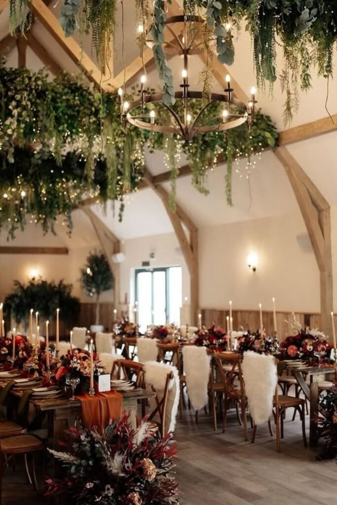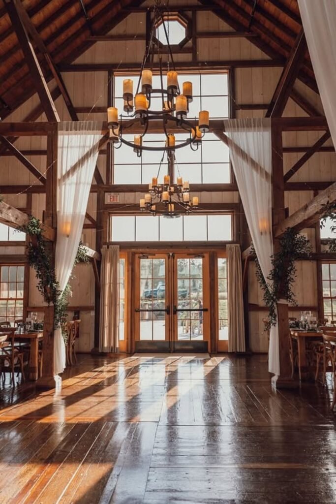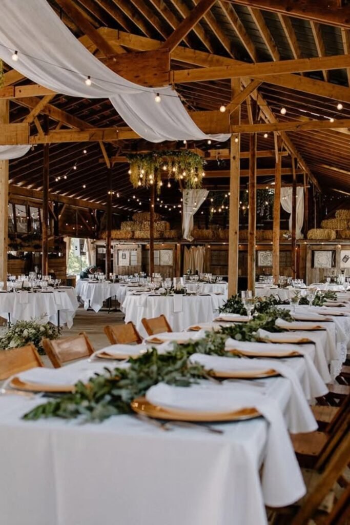 Barn venues feel elevated when you balance rustic wood with intentional lighting, greenery installations, and soft textures overhead throughout the space.