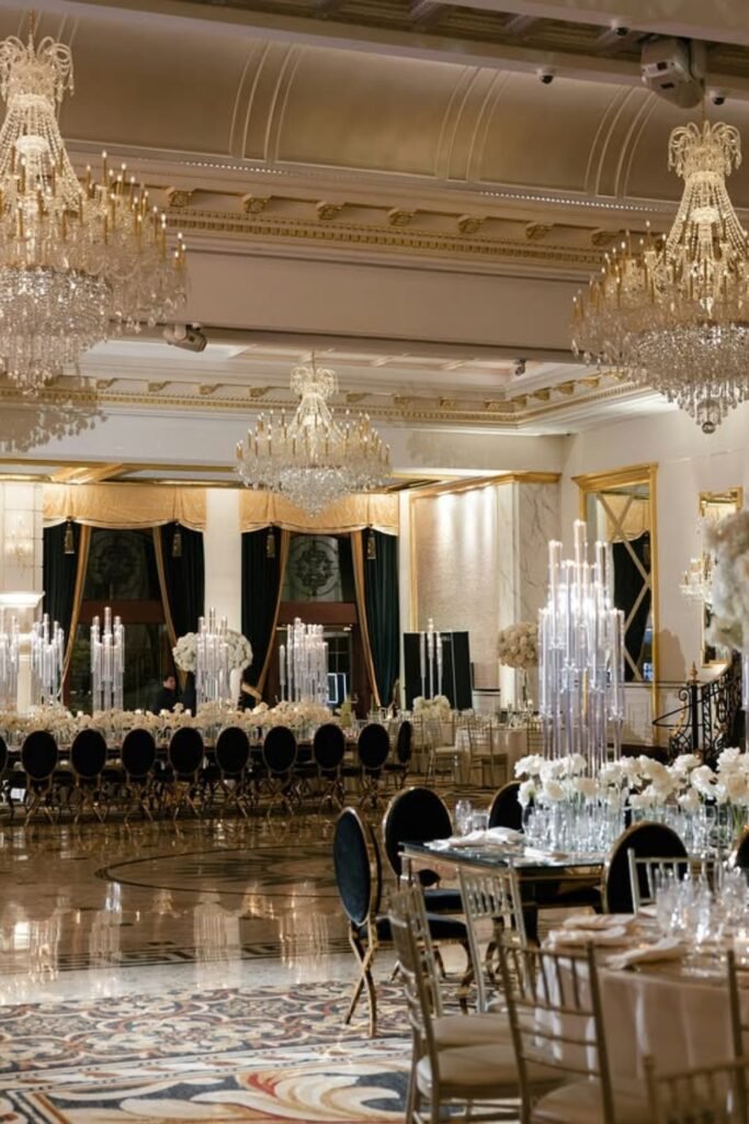 Crystal chandeliers instantly set formality, making grand ballrooms ideal for couples who want a classic and luxurious atmosphere.
