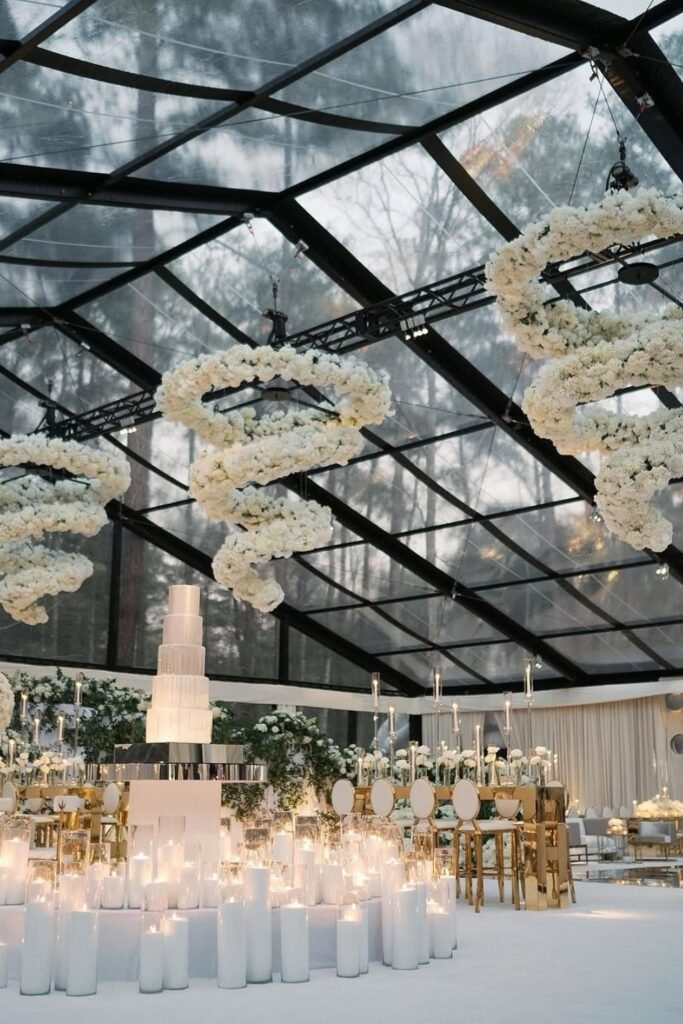 Glass-roof venues blur indoor and outdoor boundaries, letting floral installations and candlelight feel dramatic while maintaining weather protection.