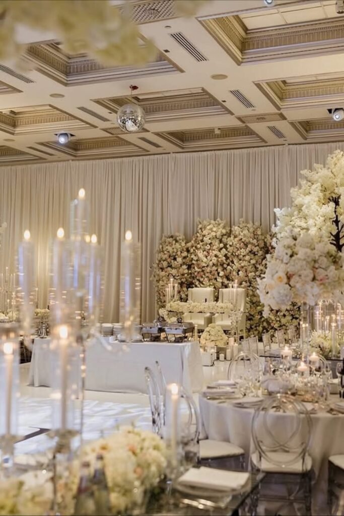 All-white floral ballrooms create a serene, romantic mood, especially for couples prioritizing softness, candlelight, and elegance.
