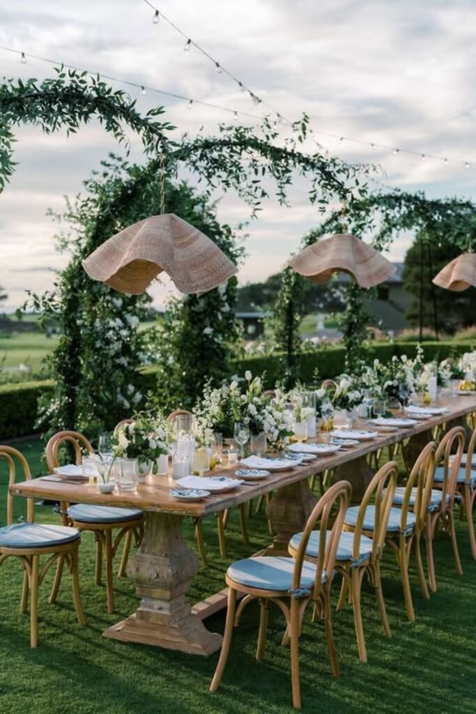 For couples drawn to organic romance, a greenery-covered pergola frames dinner beautifully, adding intimacy while keeping the space open and breathable.