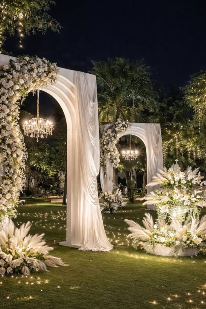 Once daylight fades, this garden wedding venue uses arches and fairy lights to create romance without heavy décor effortlessly outdoors.