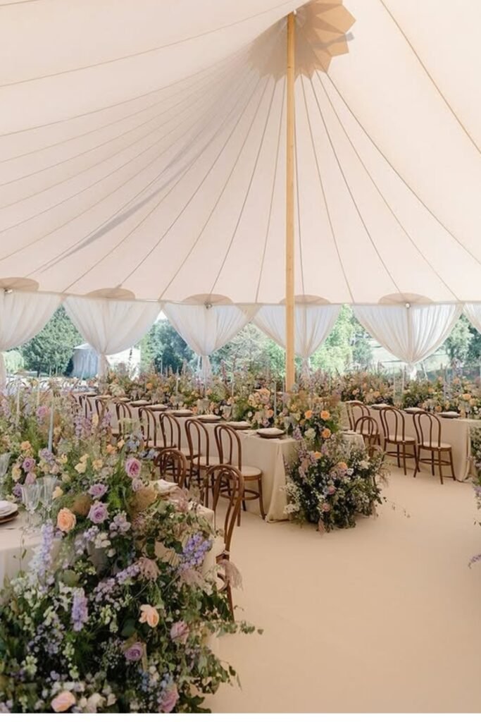 This design shines when florals frame table clusters, allowing the tent to feel styled rather than purely functional.